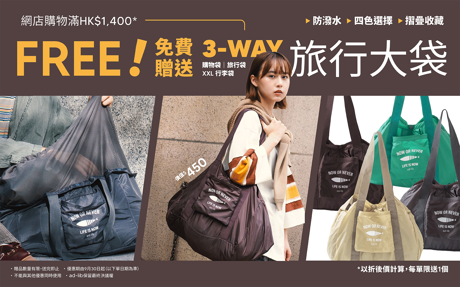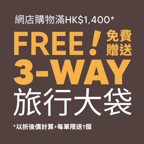 購物滿HK$1,400即送3-way旅行大袋一個 (價值HK$450)
